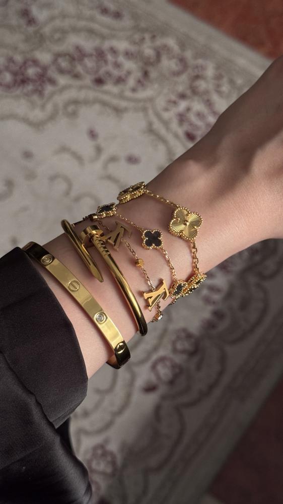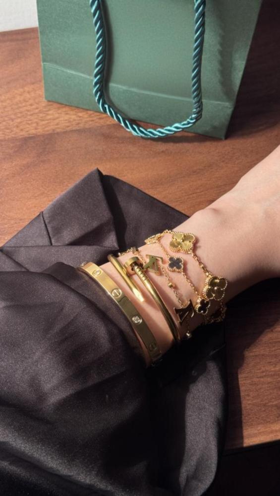 تألقي بإطلالة فاخرة مع مجموعة الأساور الذهبية المميزة التي تجمع بين الأناقة والعصرية تحتوي المجموعة على تصميمات متنوعة تشمل سوارا بتفاصيل زهرة البرسيم المصنوع من عرق اللؤلؤ، وسوارا بسلسلة ذهبية رفيعة مع عقدة أنيقة، بالإضافة إلى سوار بتصميم معدني عصري مرصع بلمسات براقة. هذه المجموعة مثالية لإبراز أنوثتك وتنسيقها مع إطلالاتك اليومية أو المسائية كما تعد خيارا رائعا كهدية فاخرة.